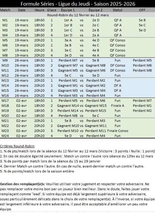 C'est congé jeudi le 5 février en raison du Championnat Provincial Double-Mixte. On soigne les blessures et on revient fort la semaine prochaine.